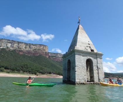 Paseo en Kayak: Navegar en kayak por el embalse hasta el mítico Campanario de Sau y alrededores durante 1h 30 min, incluyendo la clase de Aprendizaje previa.